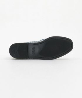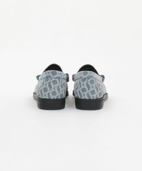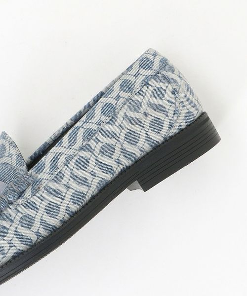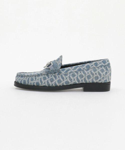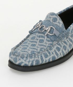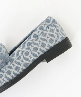 クラシカルなローファーのアッパーを大胆に総柄デニム素材へと置き換え、個性際立つ表情に仕上げています。
