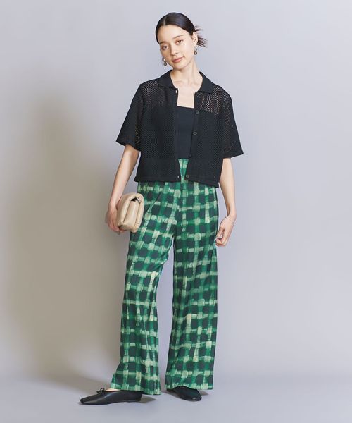 ワイドシルエットでリラックス感がありながら、やわらかな光沢と表面感のある生地がカジュアルになりすぎず大人ムードを漂わせます。