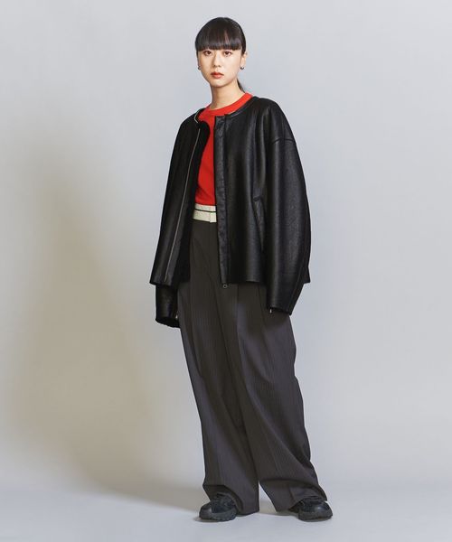 Tシャツとメンズライクなタックパンツに羽織るだけで重厚感のあるスタイルが完成。