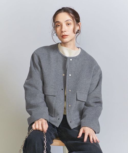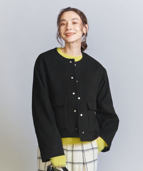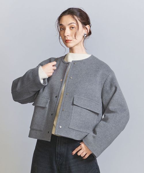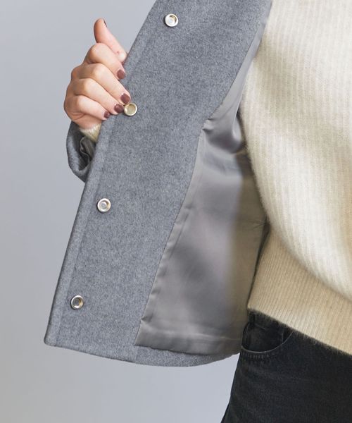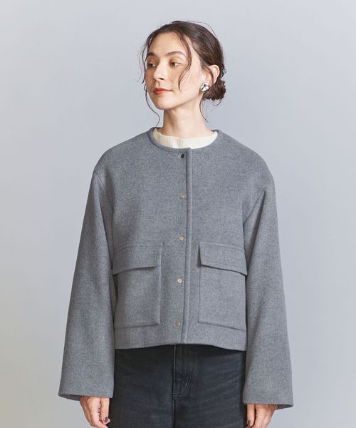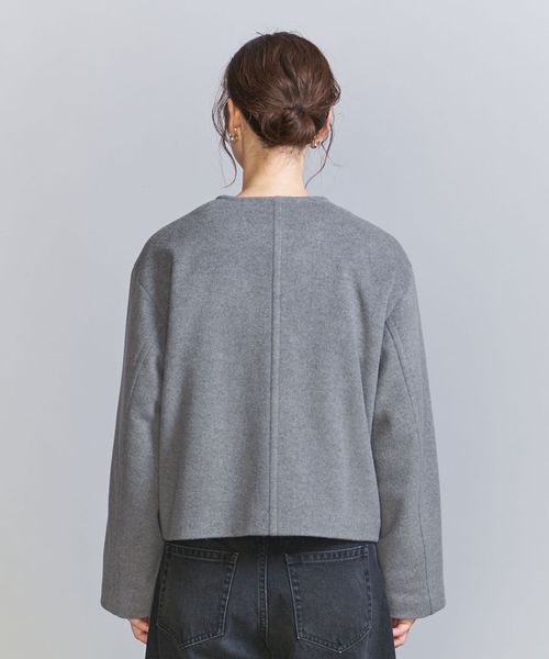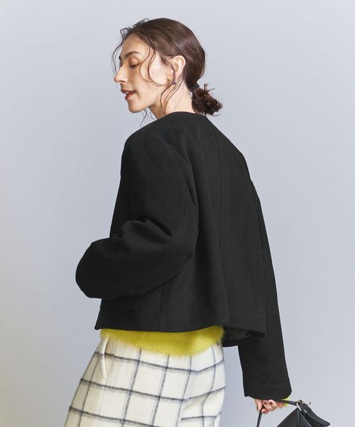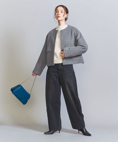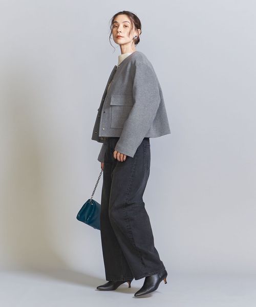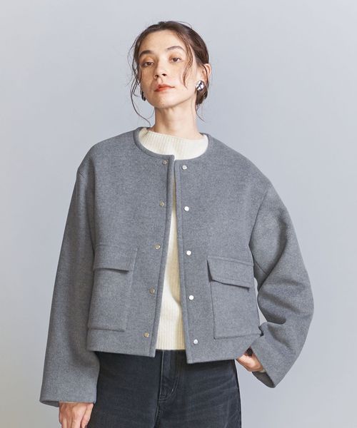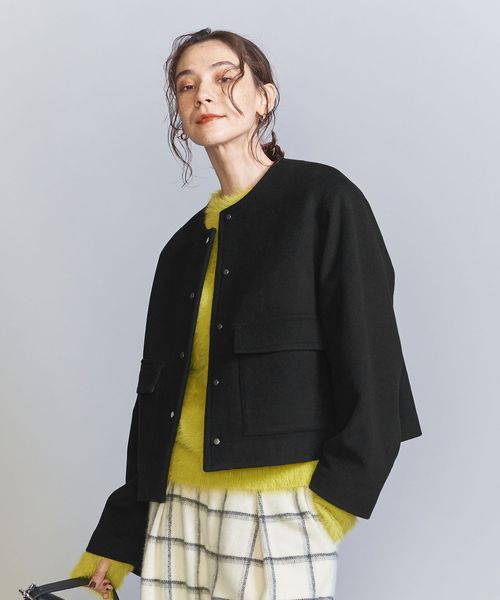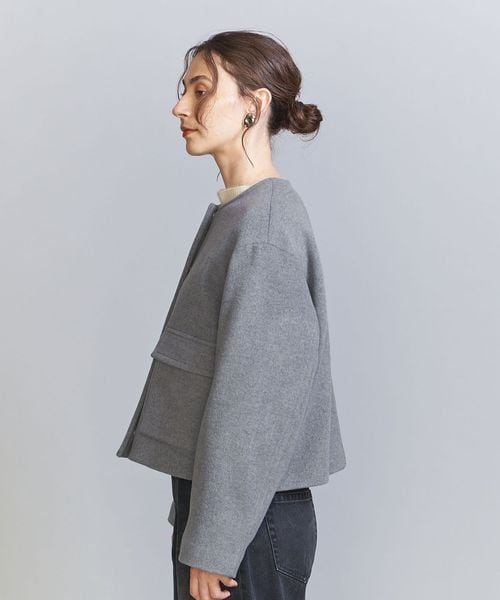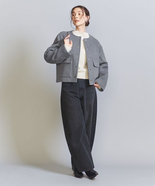 カジュアルにもきれいめにも。品よく決まるノーカラーショートコート。