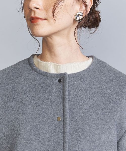 すっきりとしたノーカラーデザインは、タートルネックやストールとも合わせやすく、秋冬ならではの着こなしもおすすめ。