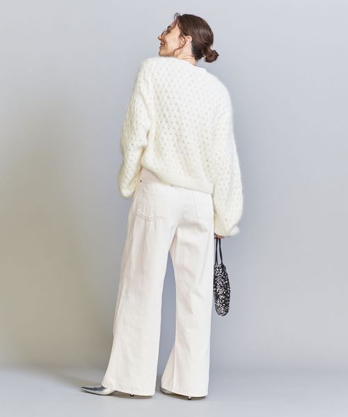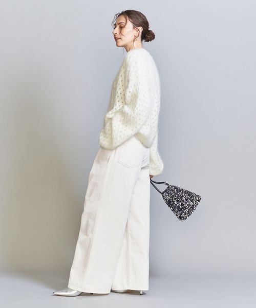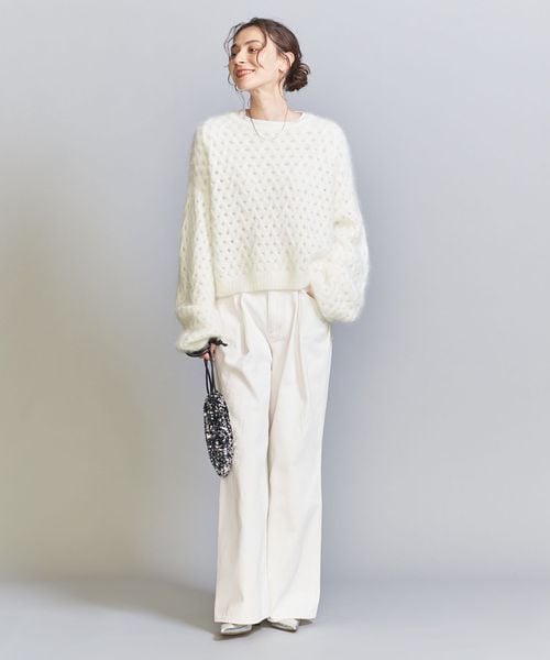 毛足のあるモヘヤニットや甘めのトップスなど、フェミニンなアイテムをミックスした着こなしがおすすめ。