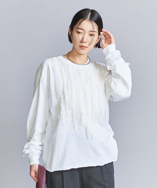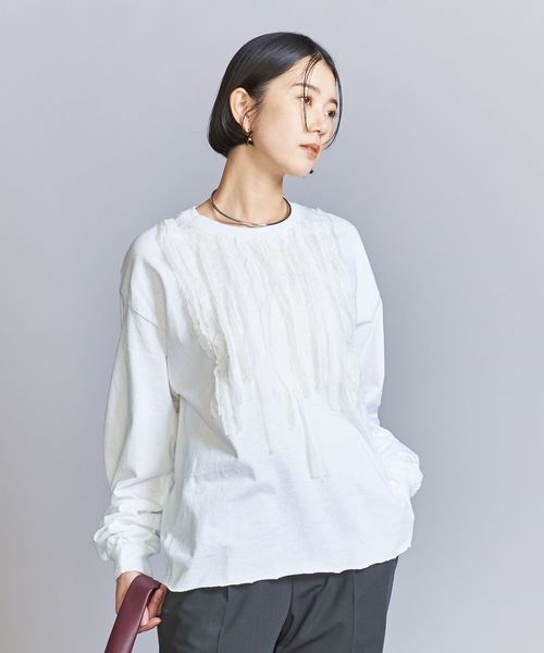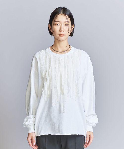 シンプルなTシャツに同系色の別布でフロントを装飾した、クラフト感あふれるロングスリーブカットソー。