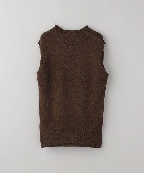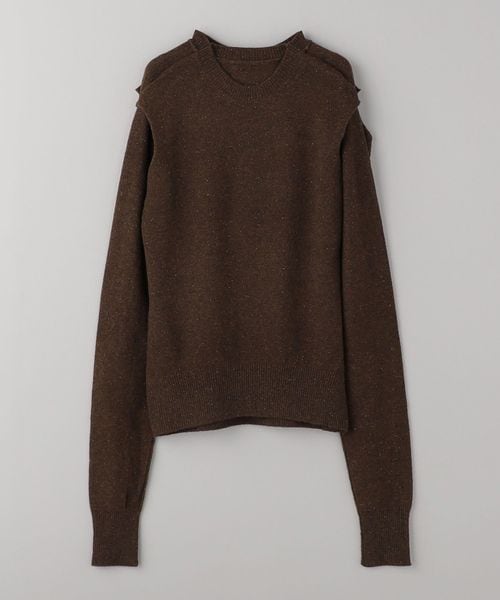 肩のスリットが視線を引き付ける、ユニークなニットトップス。