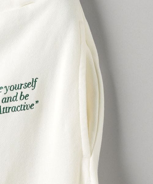 クリーンな印象のホワイトに映えるグリーンのロゴ刺繍を腰に添え、アクセントをプラス。