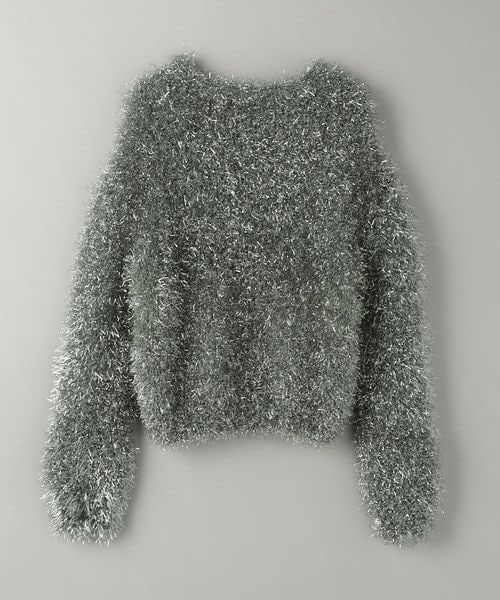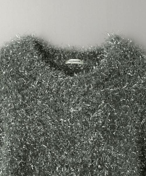 シルバーラメに見えるグレーのフィルム状の糸を使用して編み立てたニットプルオーバー。