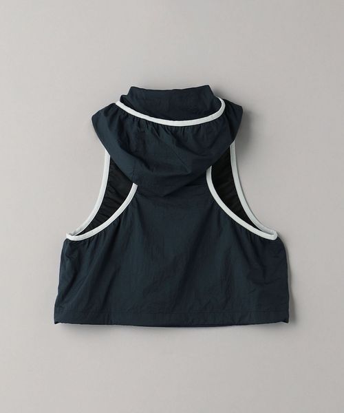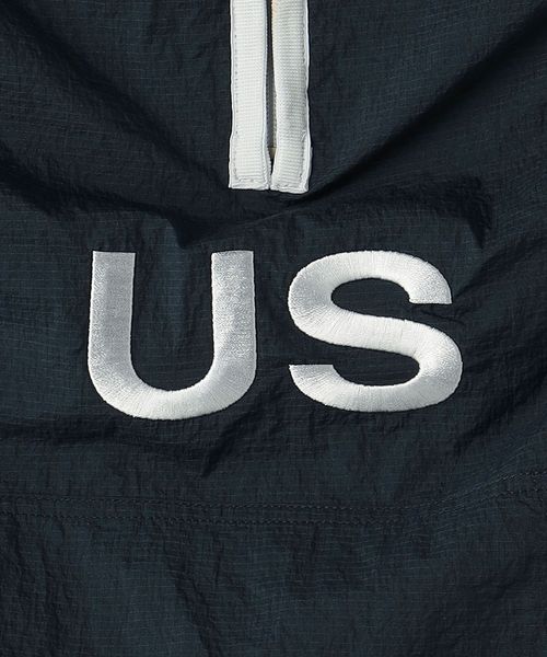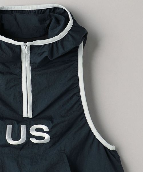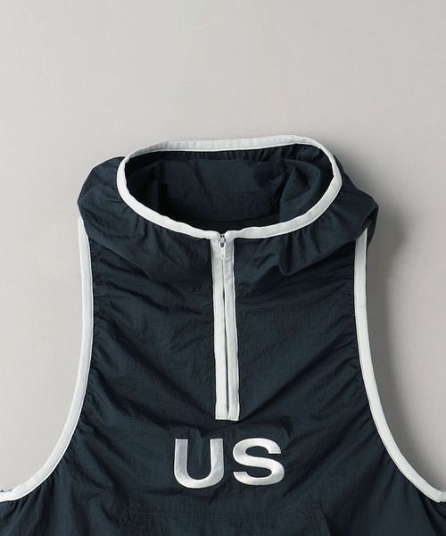 “US”ロゴ刺繍が目を引く、ナイロン素材のスリーブレスフーディ。