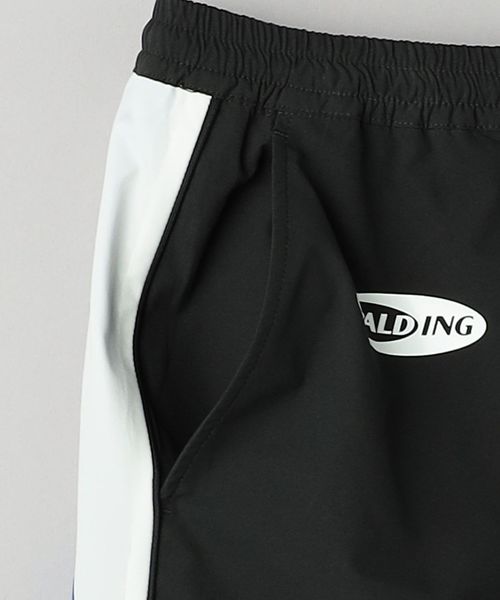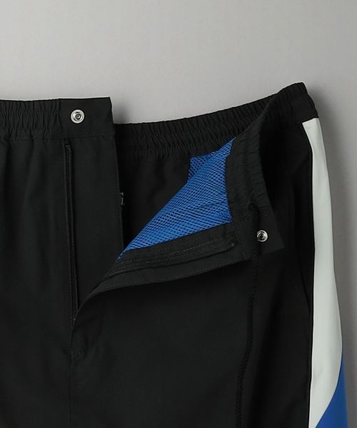 シャリ感のある素材にブルー×ホワイトのラインが映える、スポーティームードのスカート。