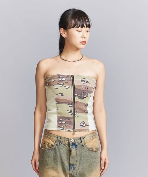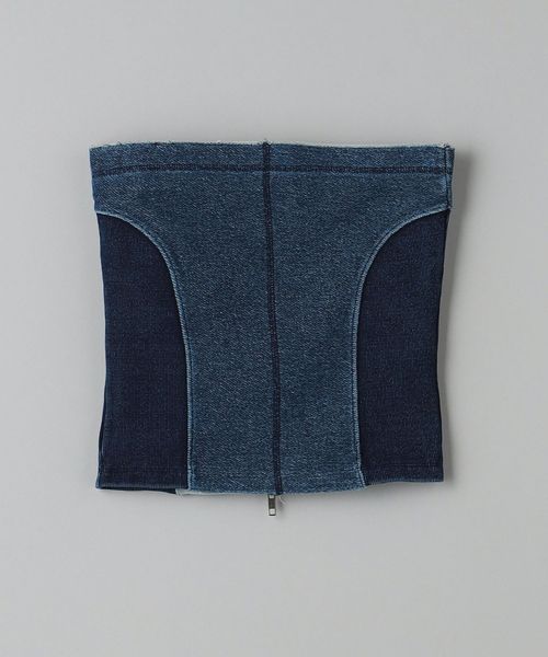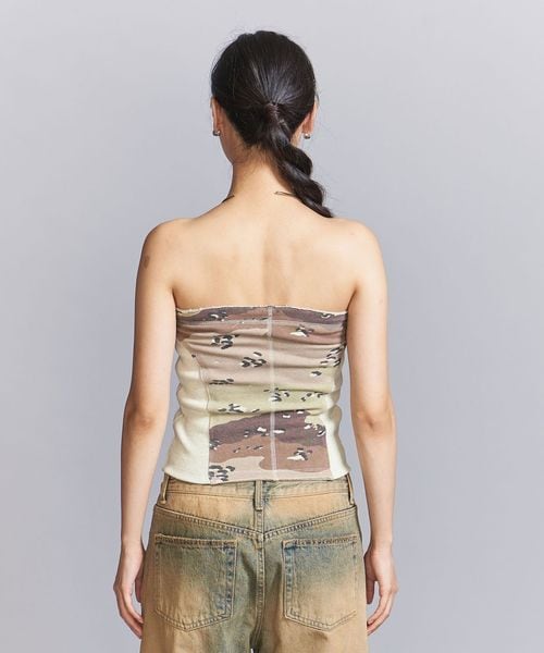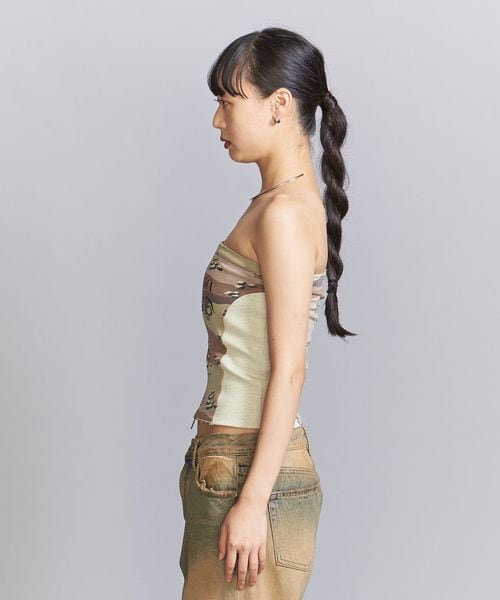 ニットの質感の生地と、リブパネルを掛け合わせたベアトップ。