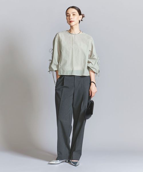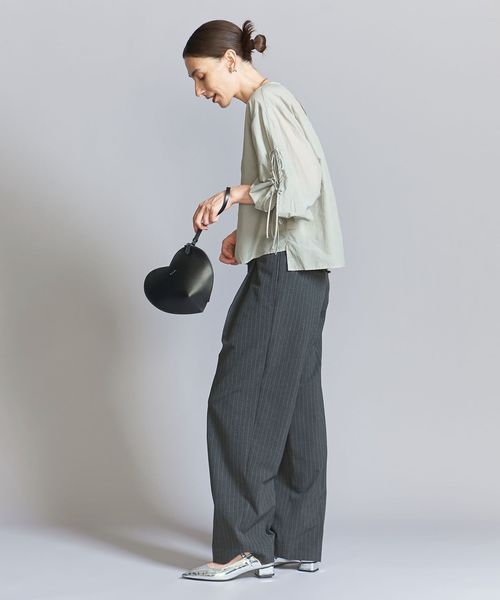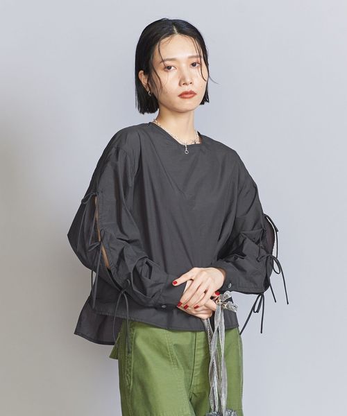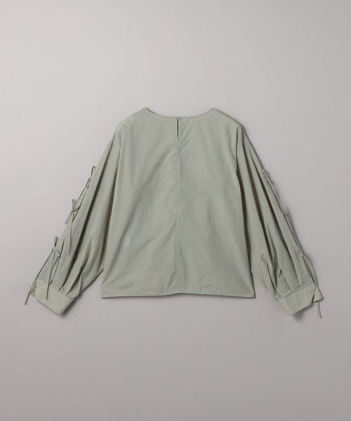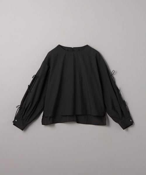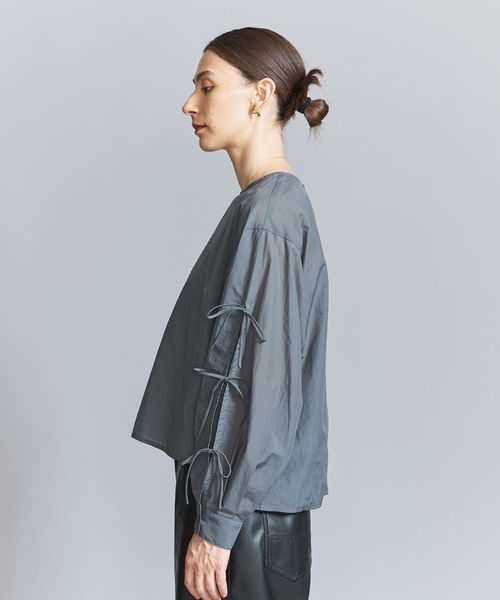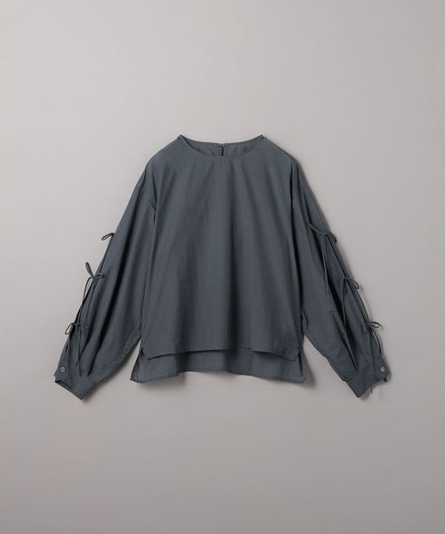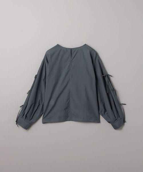 袖のスリットに華奢なリボンをあしらったボリュームスリーブブラウス。