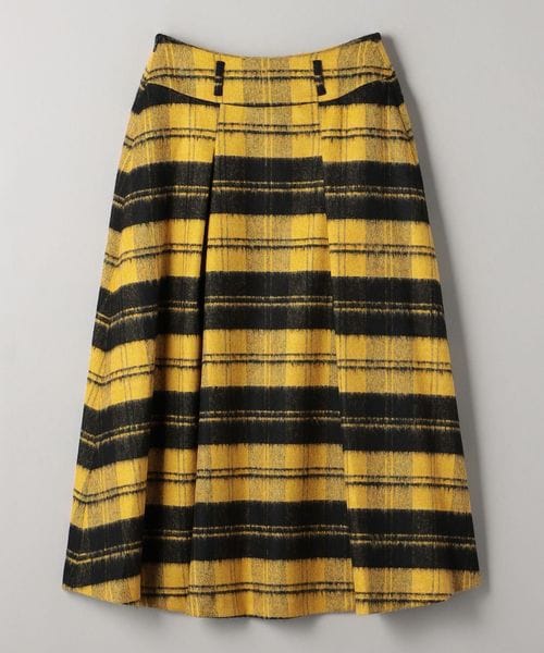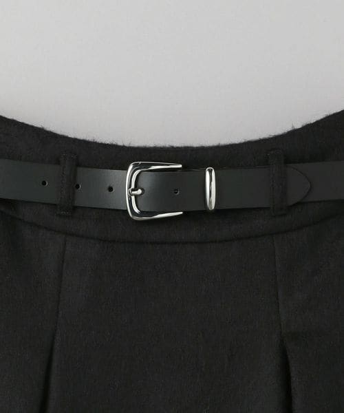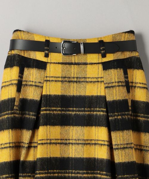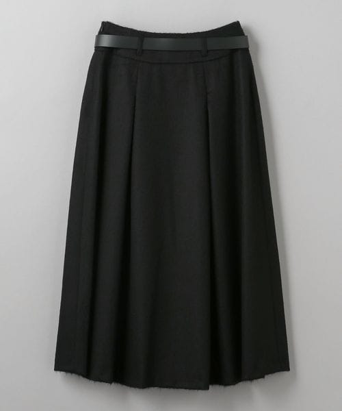 特徴的な素材を使用したべルト付きプリーツスカート。