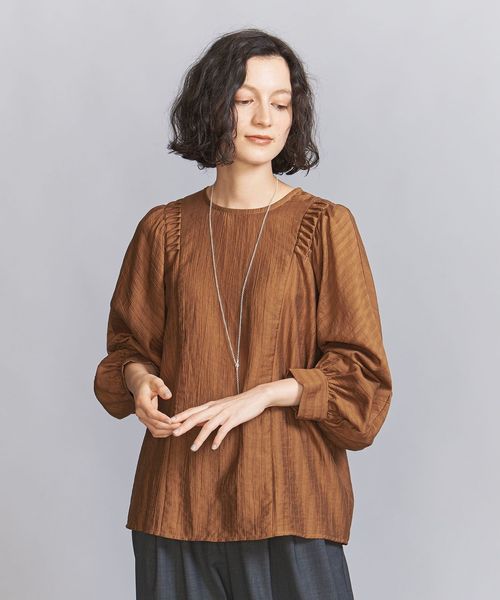 肩にピンタックを寄せ、袖にボリュームを持たせたドルマンスリーブがポイントのブラウス。