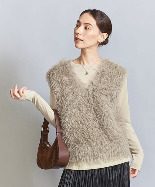 ふわふわとした毛足の長いフェザーヤーンがキャッチーなニットベスト。