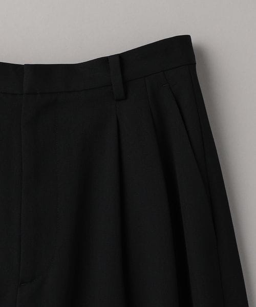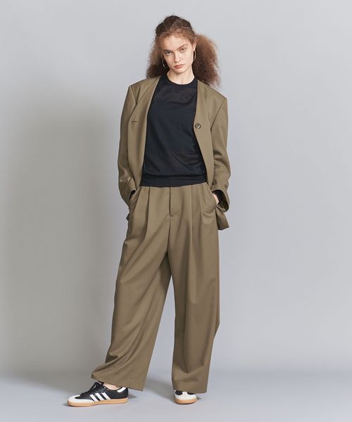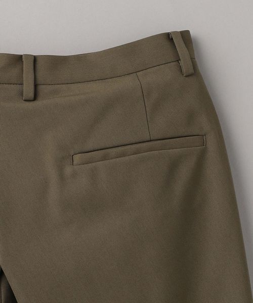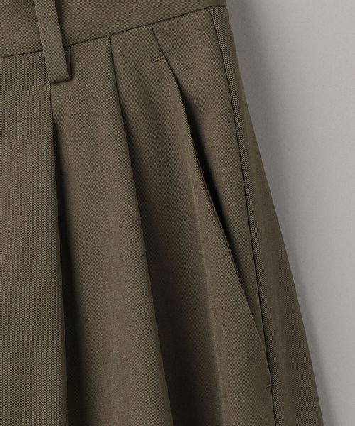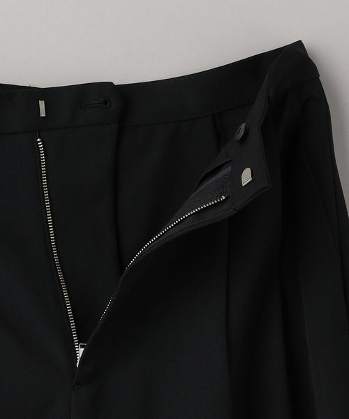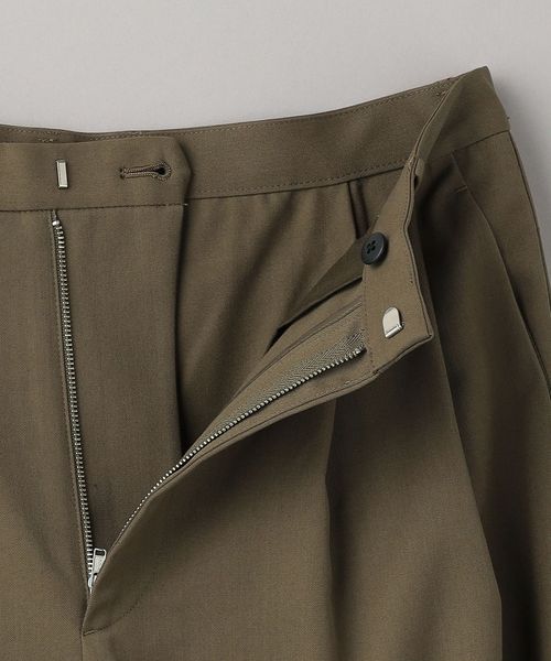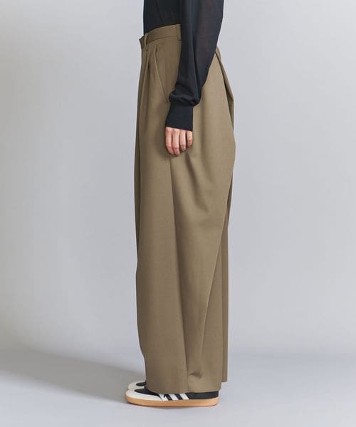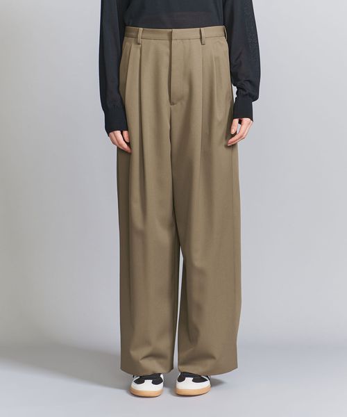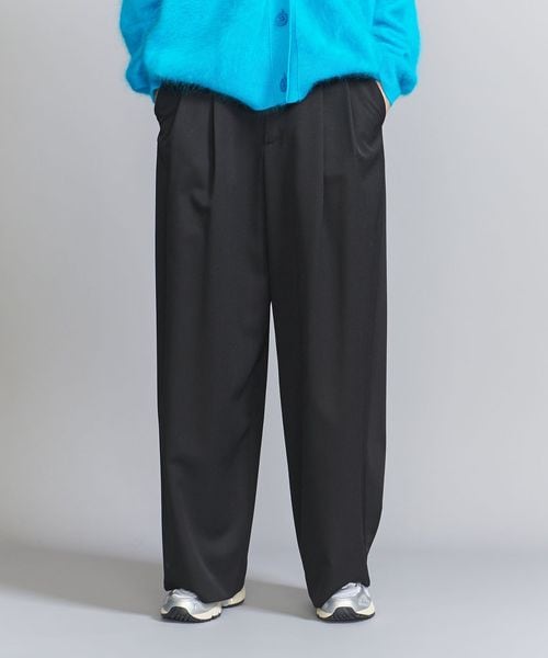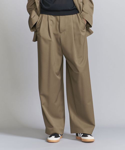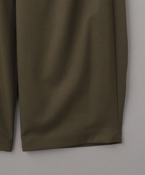 フロントから見ると一見ベーシックな2タックパンツでありながら、裾部分にバックラップの分量がシルエットに出ることで一味違った印象に仕上がっています。