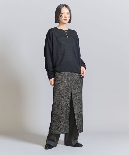 一枚でタイトスカートとしてレディな着こなしはもちろん、下にデニムやパンツを合わせてスリットを深く開けたオーバースカートとしても◎。