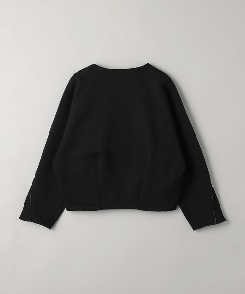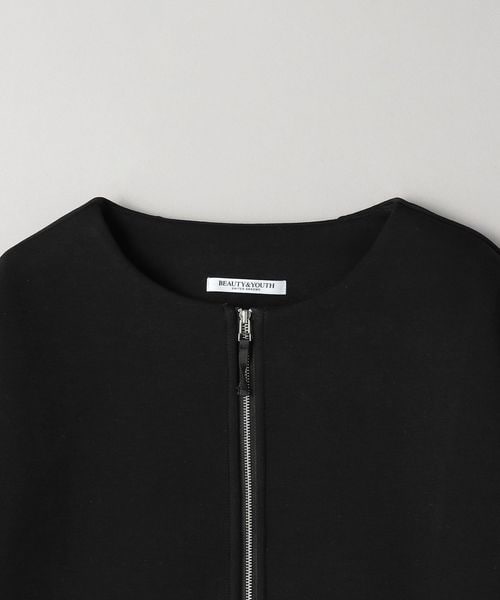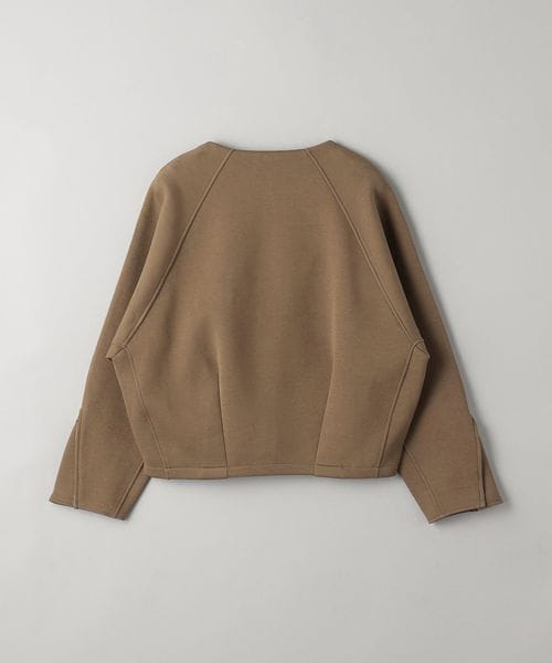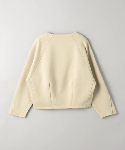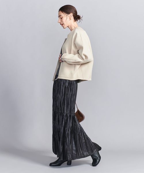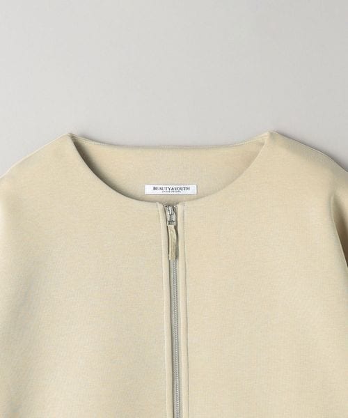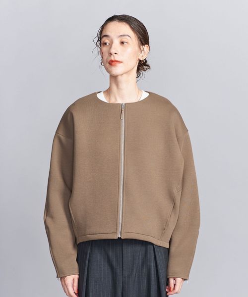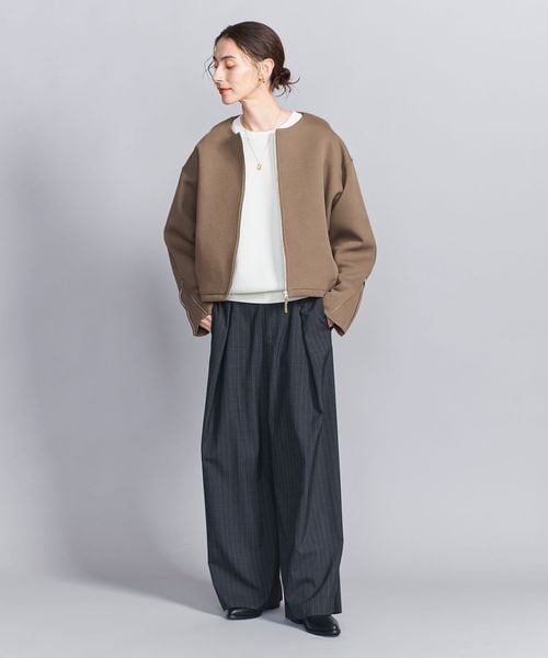 すっきりと見えるノーカラーで、秋冬にはタートルネックやニット、春先にはカットソーやブラウスなど、合わせるインナーを選ばずお召しいただけます。