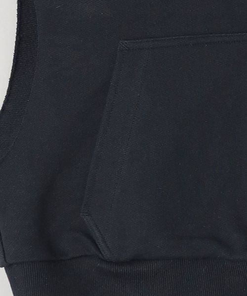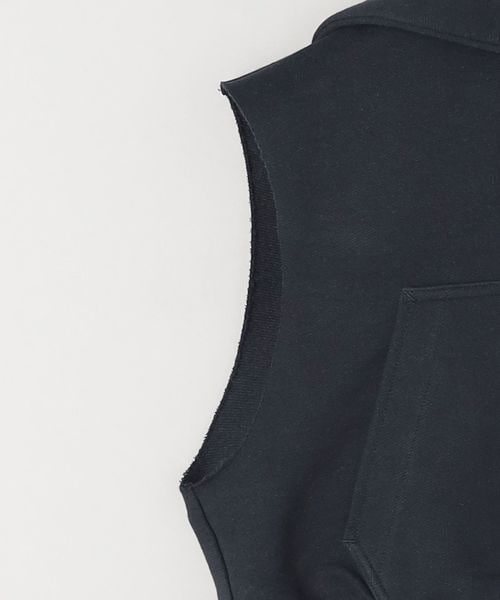 スウェット素材(インレイ)を使用したセーラーカラーのノースリーブショートジップカーディガン。