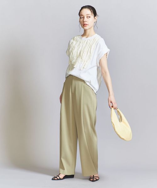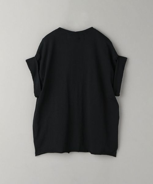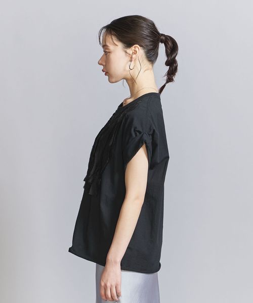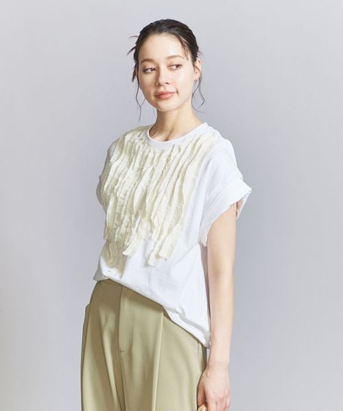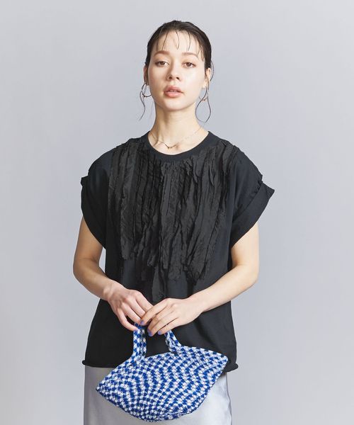 シンプルなTシャツに、別布でフロントを装飾したクラフト感あふれるショートスリーブカットソー。