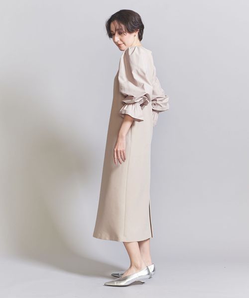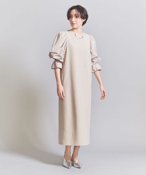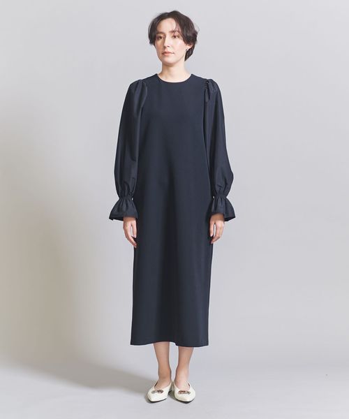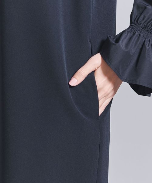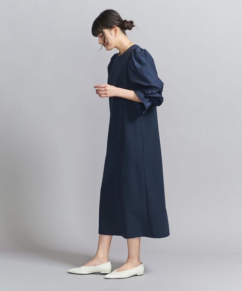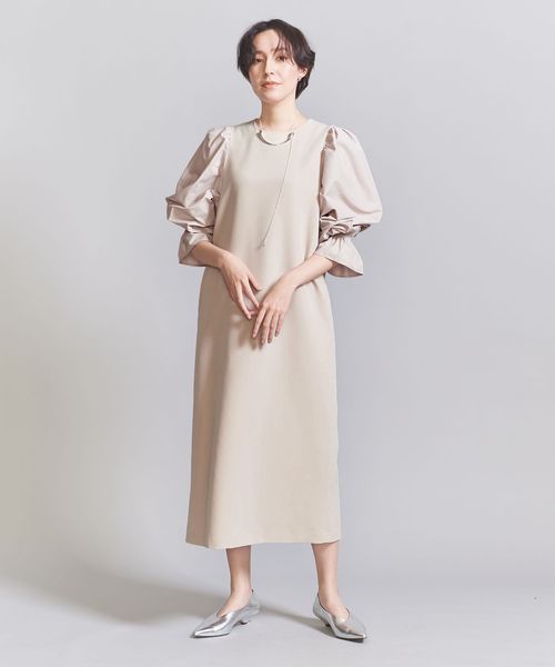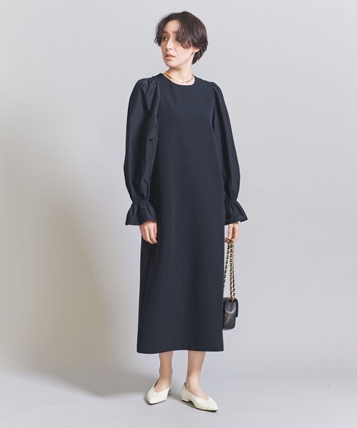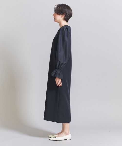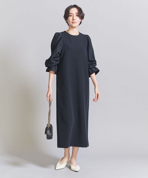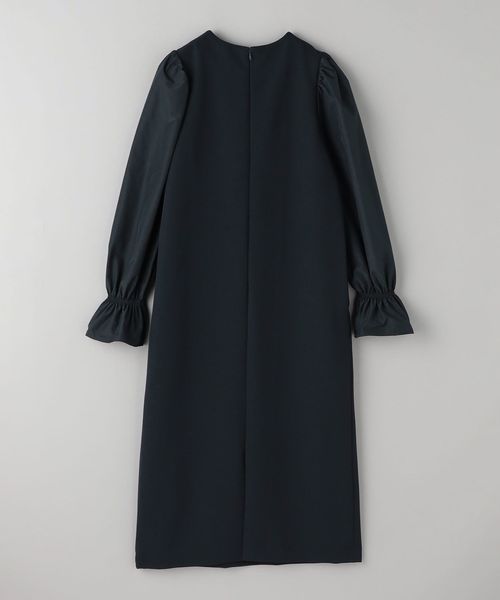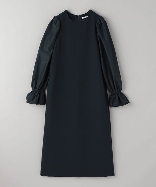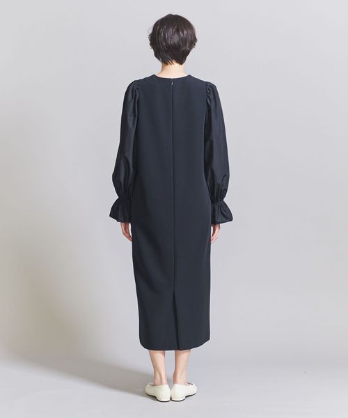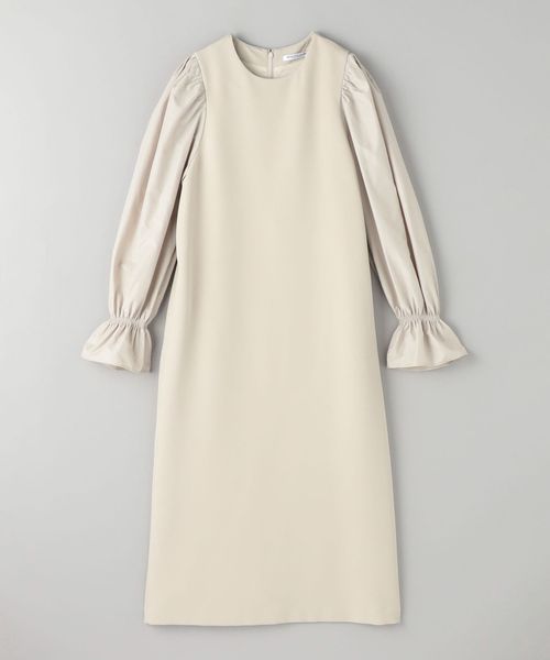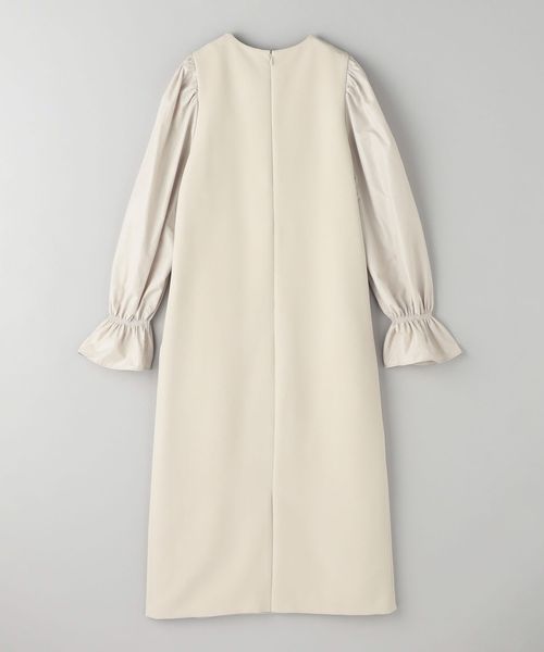 レイヤードしているように見える、異素材の身頃と袖をドッキングさせたワンピース。