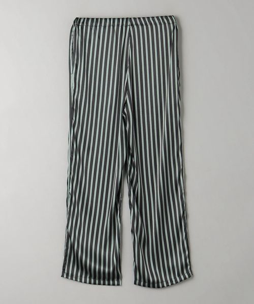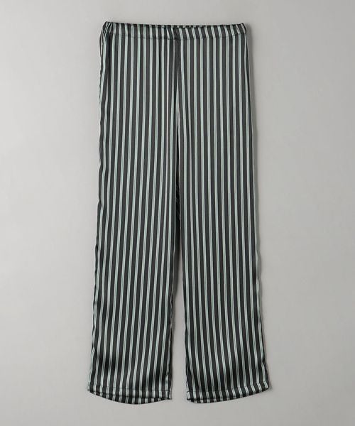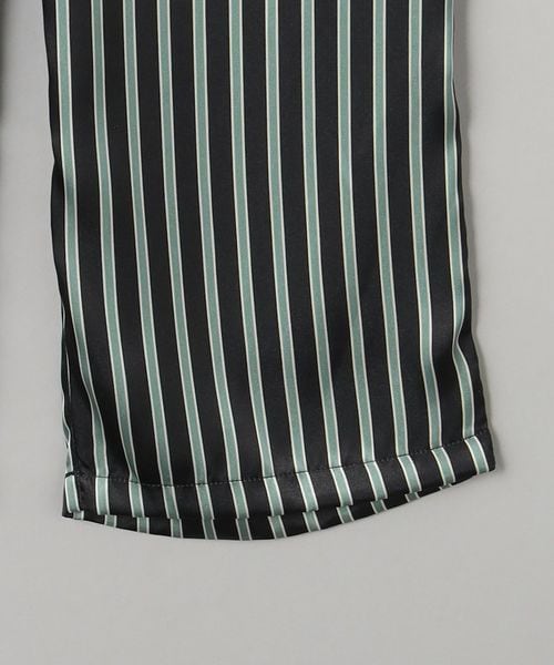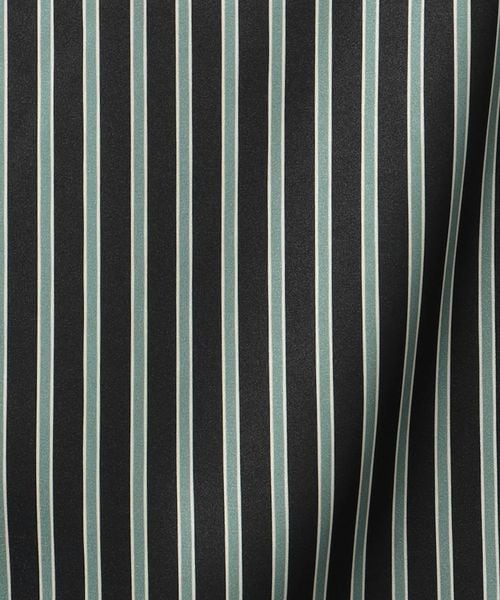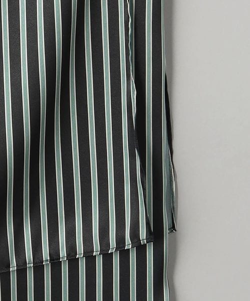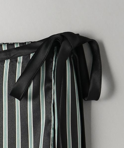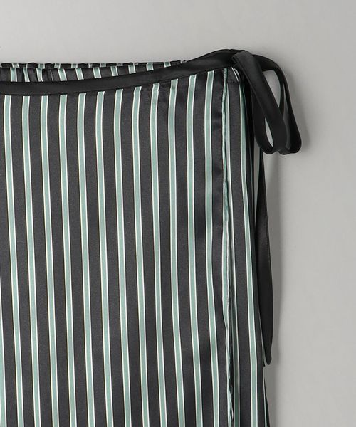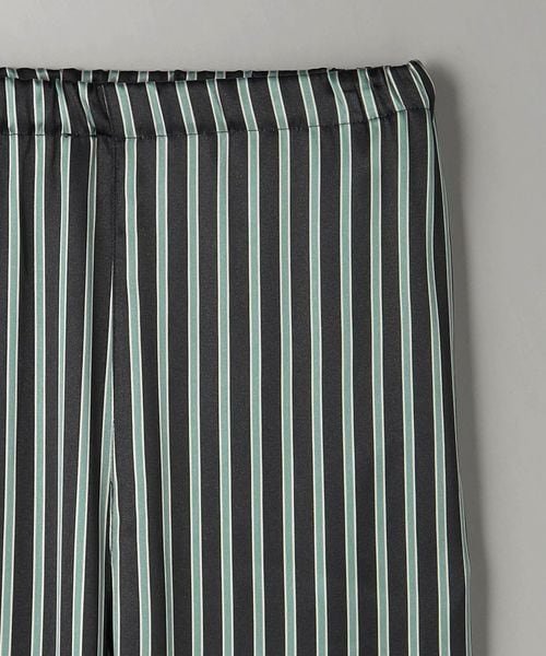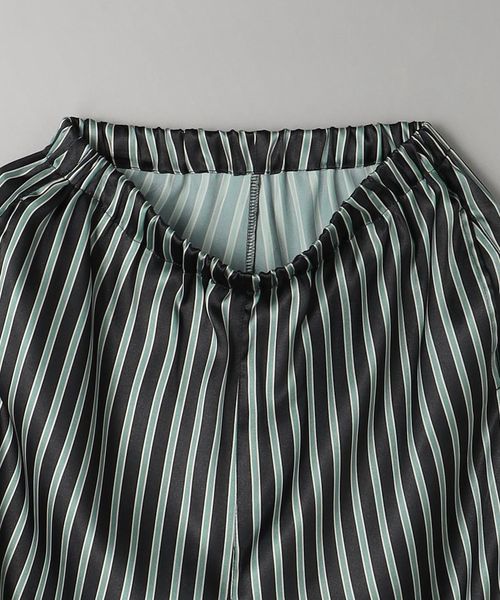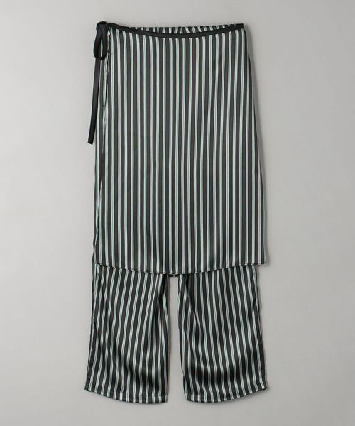やや光沢のあるストライプ柄素材のスカートとパンツをレイヤードした一着。