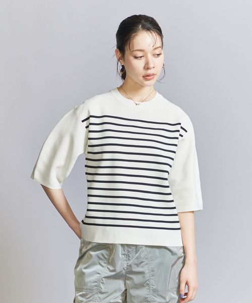 やや丸みあるスリーブデザインが印象的なニットプルオーバー。