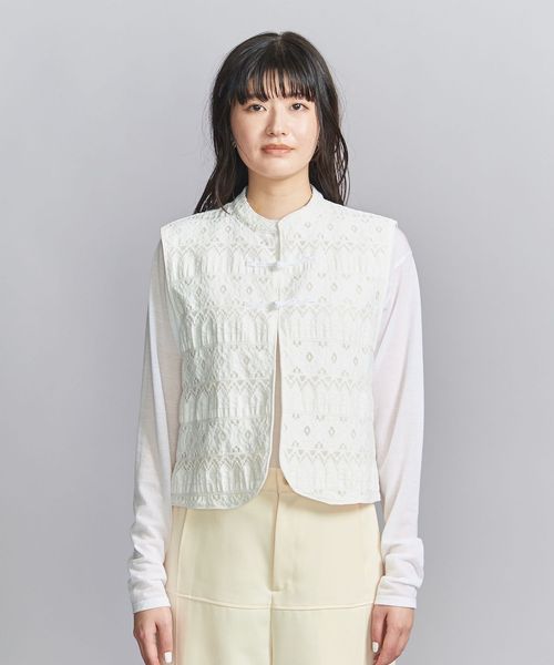 スタンドカラーにチャイナ釦使いのコンパクトなレースベスト。