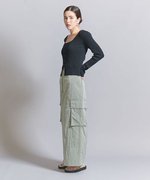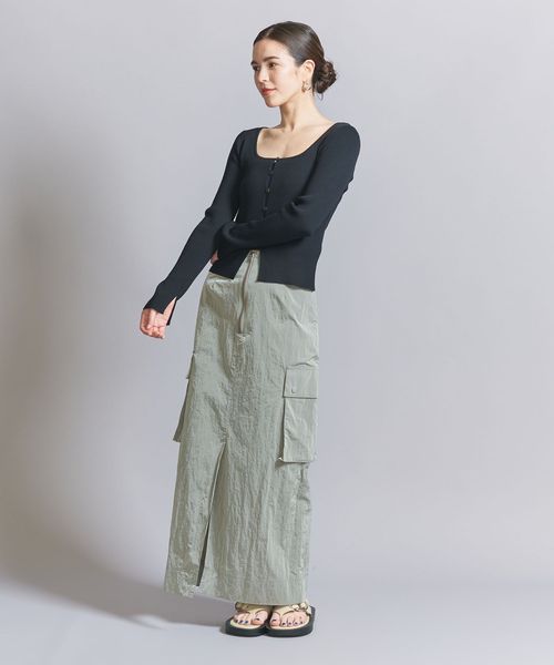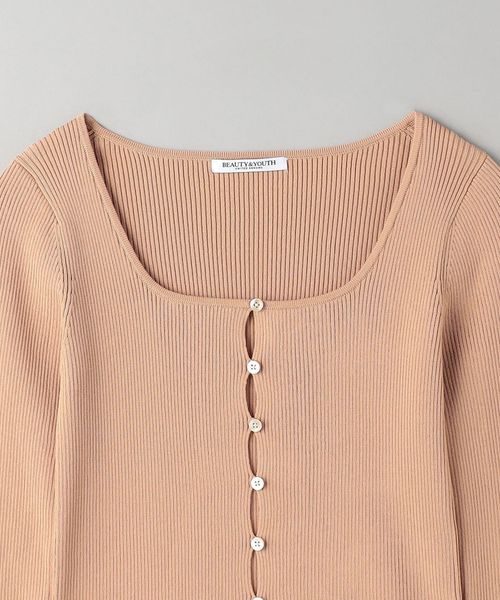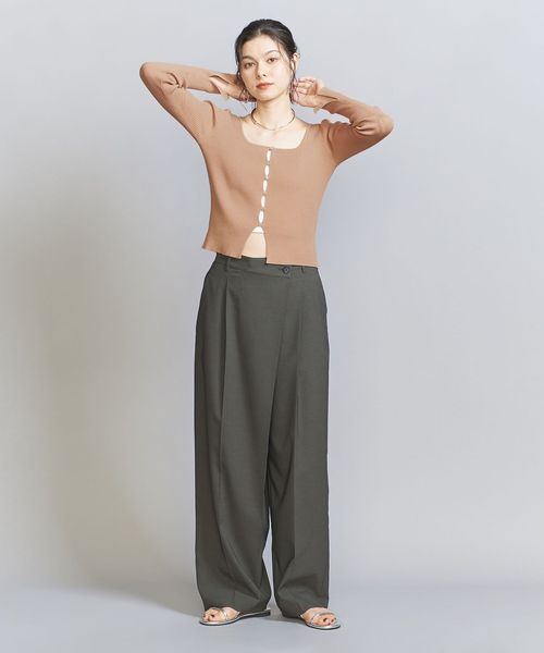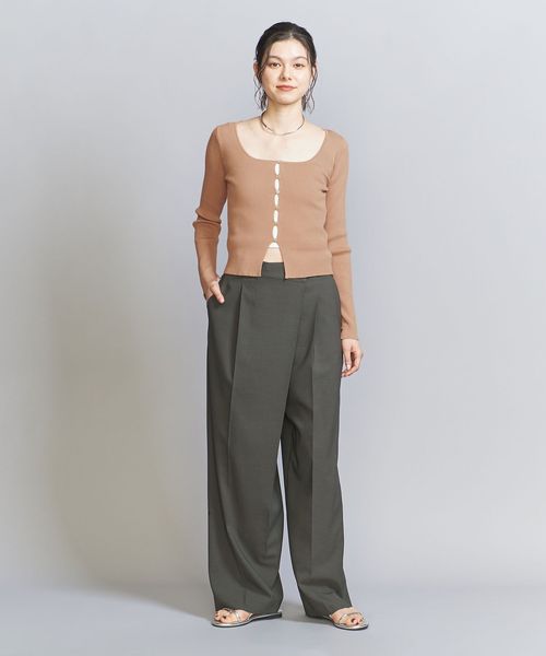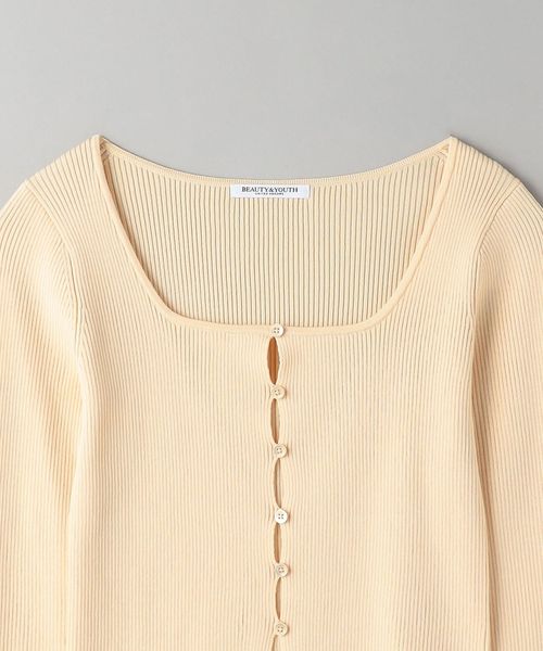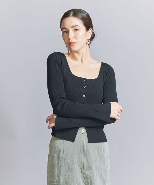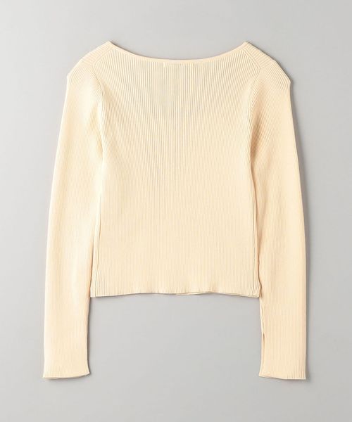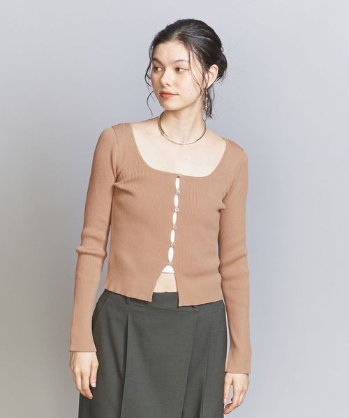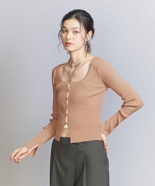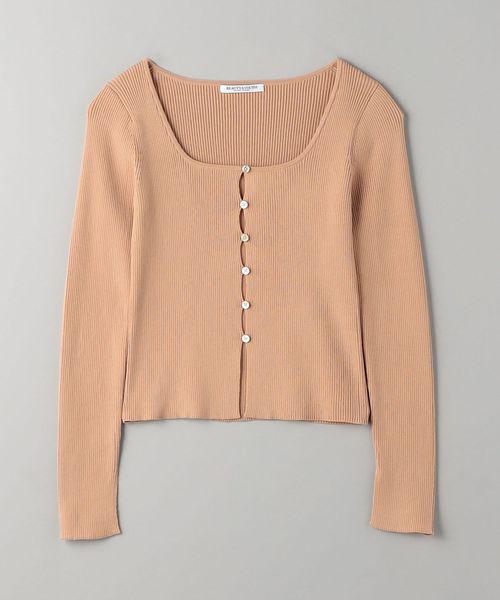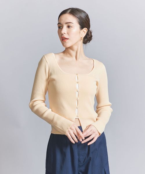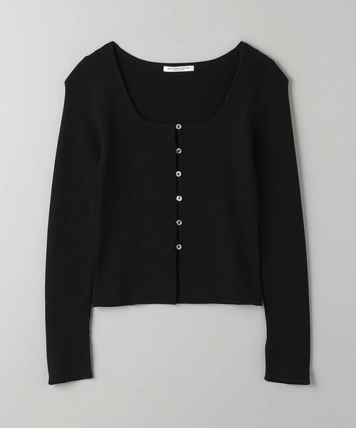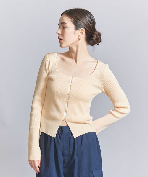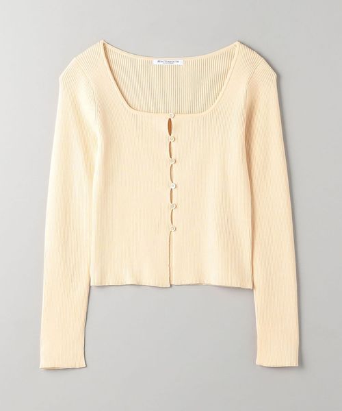 顔周りをすっきりと見せてくれるスクエアネックのカーディガン。