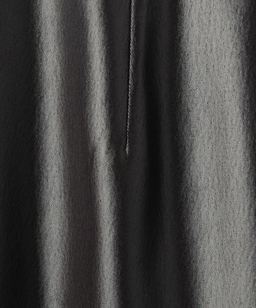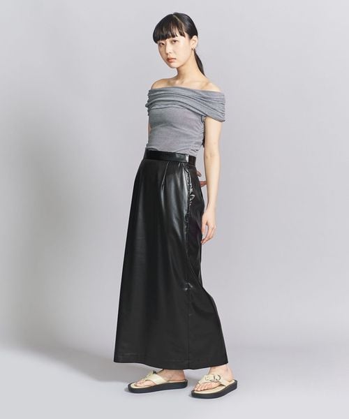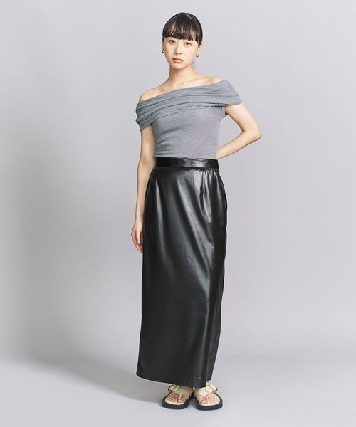 ツヤのある表面感を活かし、表情のある編地のニットトップスなどとのコーディネートがおすすめ。