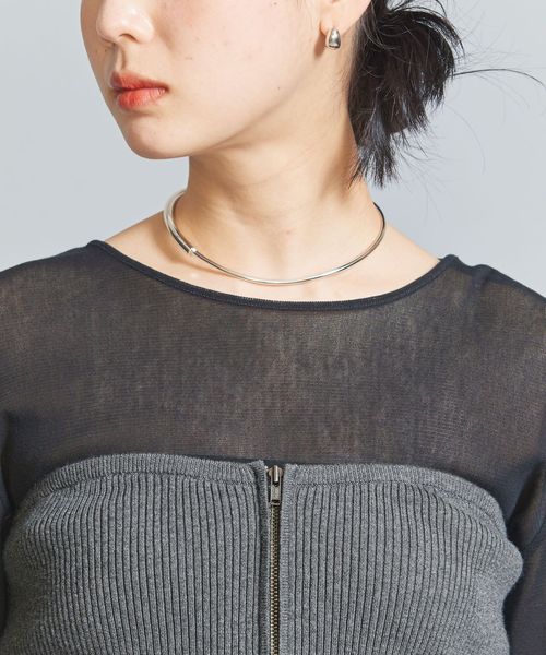胸元にはややカーブをつけフェミニンなムードをプラスしながら、さまざまなトップスとのレイヤードが様になるデザインに。