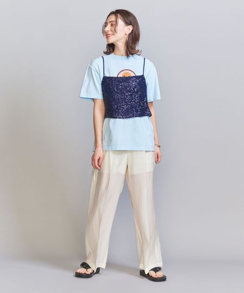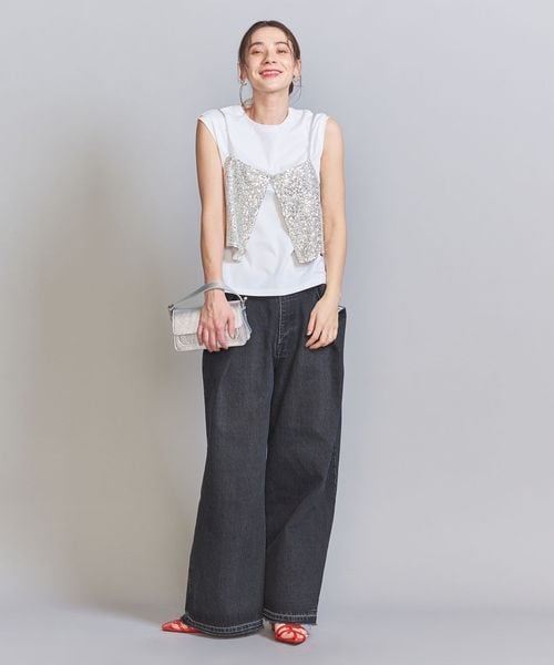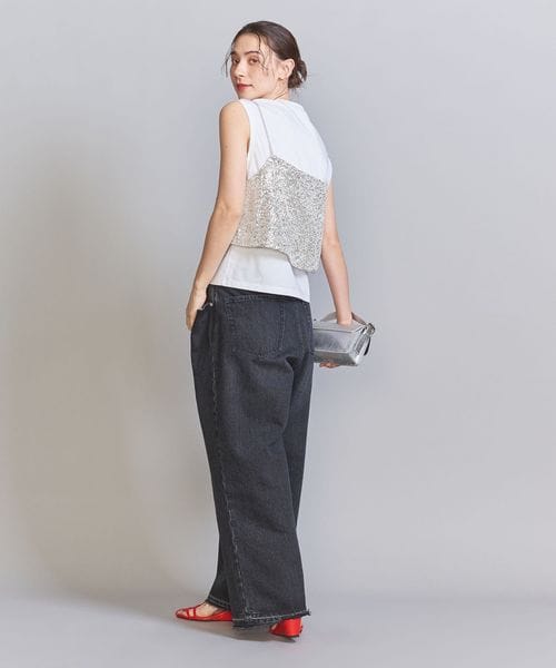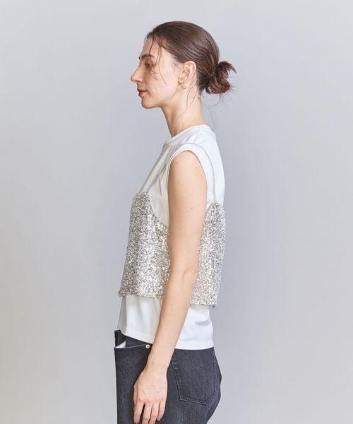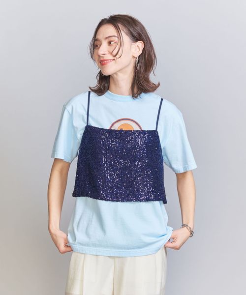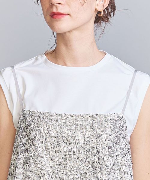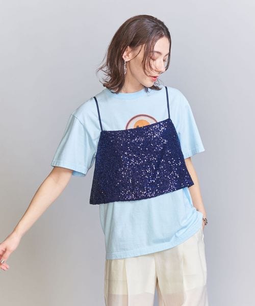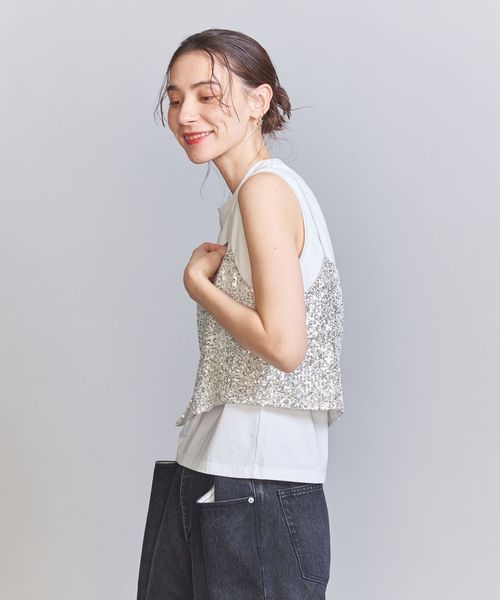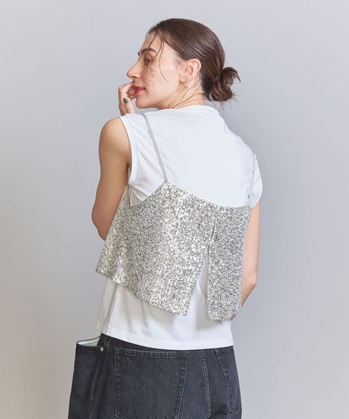 スパンコールの華やかな表情が目を引くキャミソールトップス。