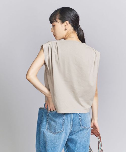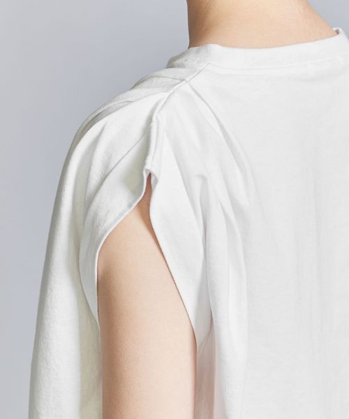 肩にランダムタックを施し、たくし上げたようなディテールが目をひくクルーネックカットソー。