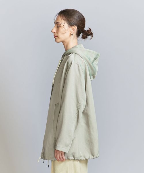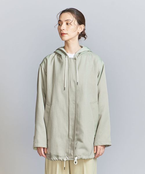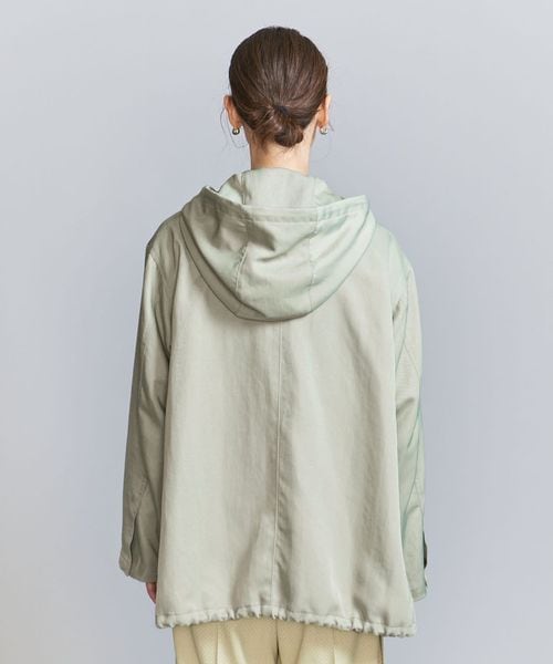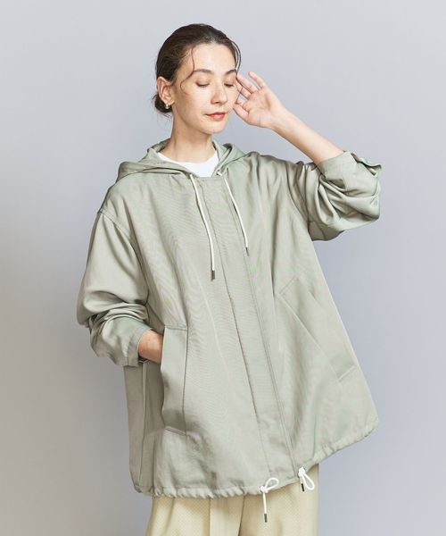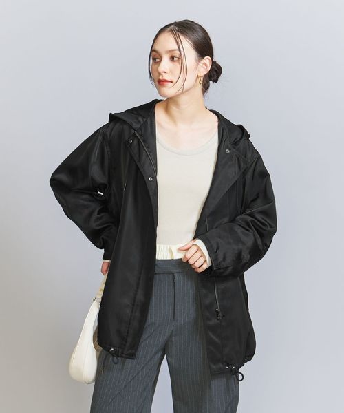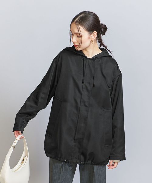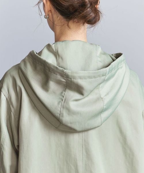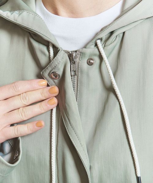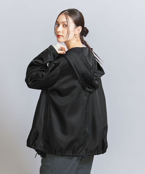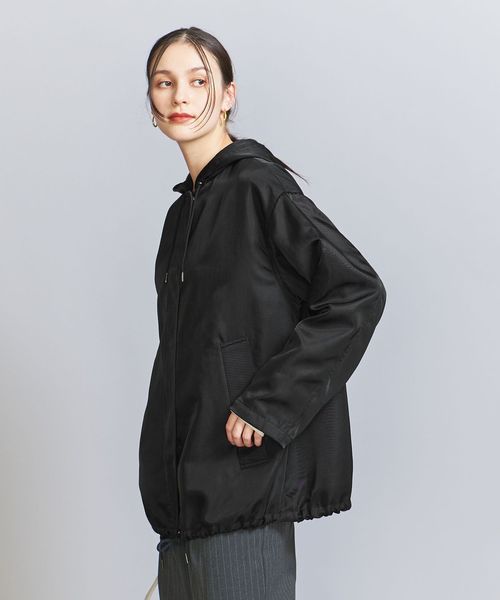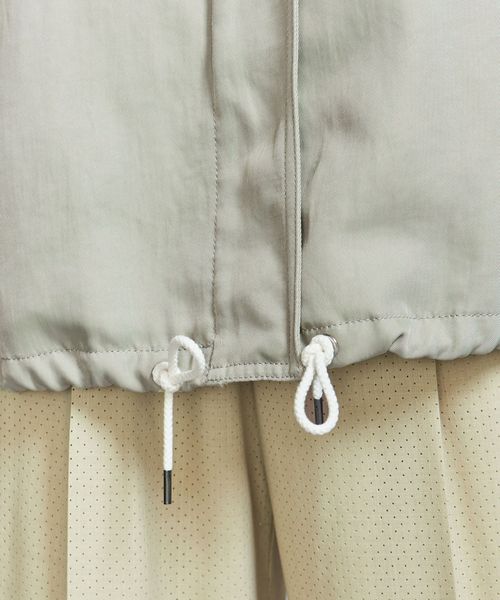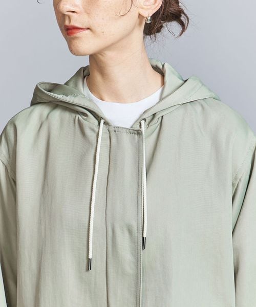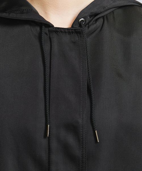 光沢のあるナイロンツイル生地を使用したフーディーアウター。