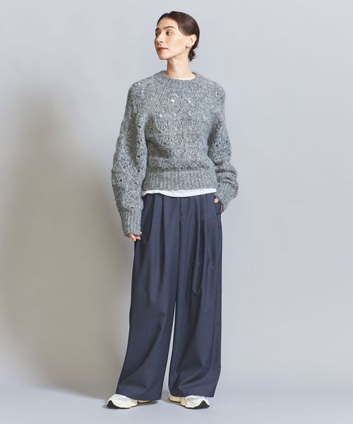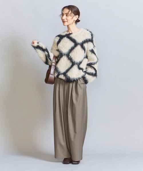 毛足のあるニットやシアーなアイテムを合わせたトレンド感のある装いも◎。