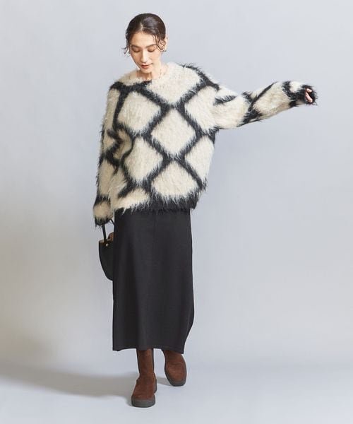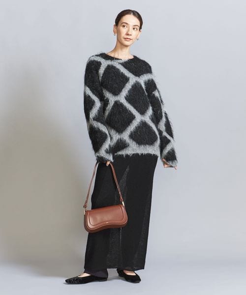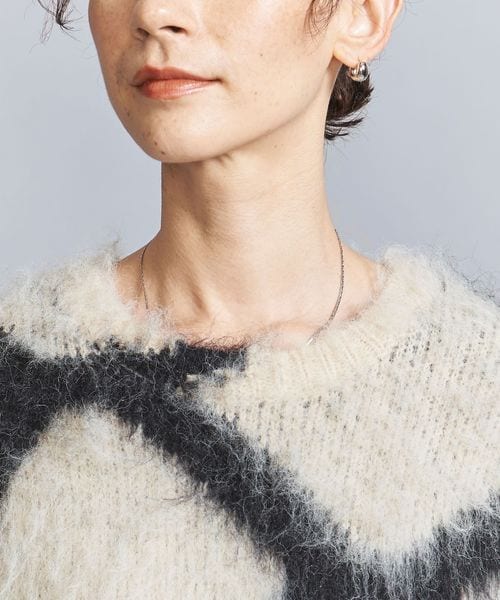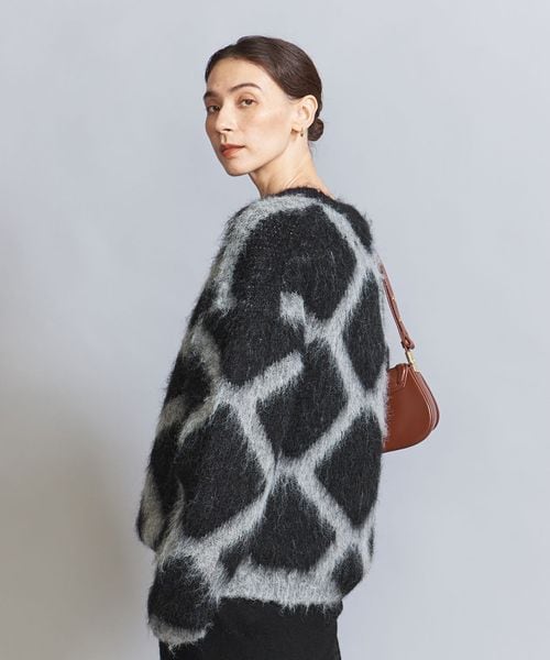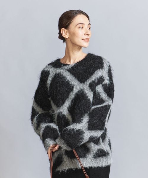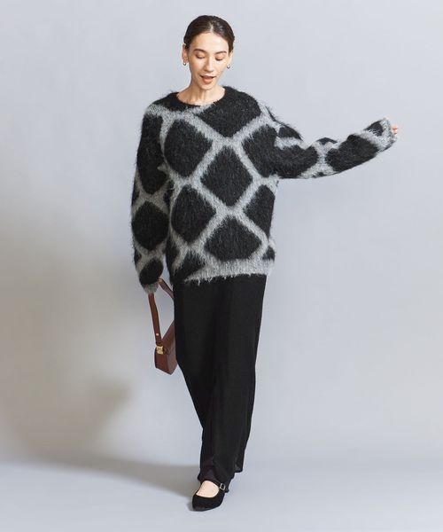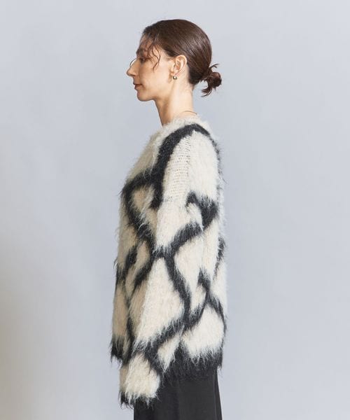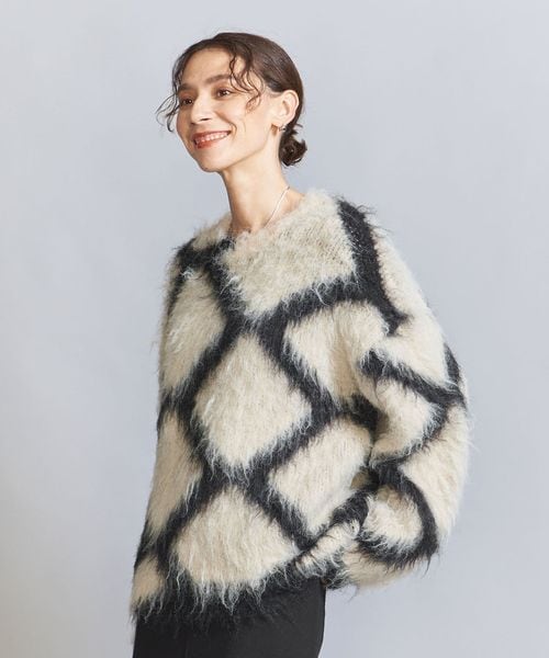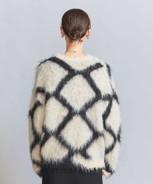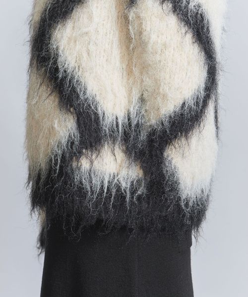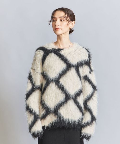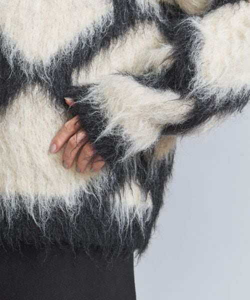 インパクトのある大きなクロス柄をジャカードで編み立てたシャギーニットプルオーバー。