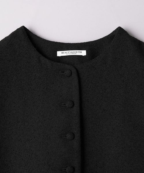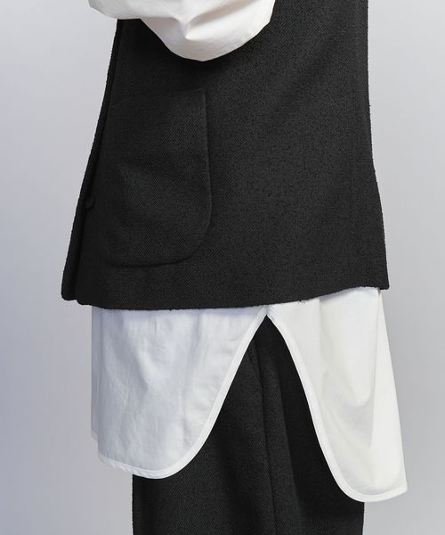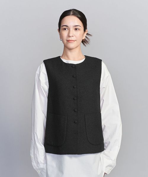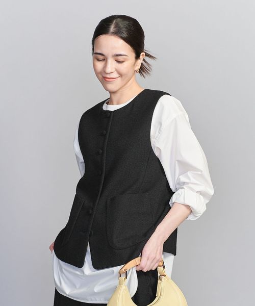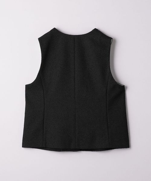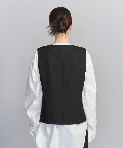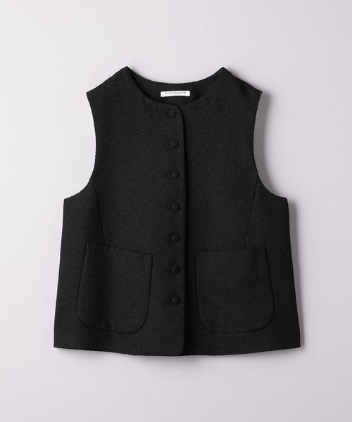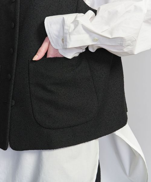 表面感のあるツイードライクな生地に大きめのクルミボタンが目を引くノーカラーベスト。
