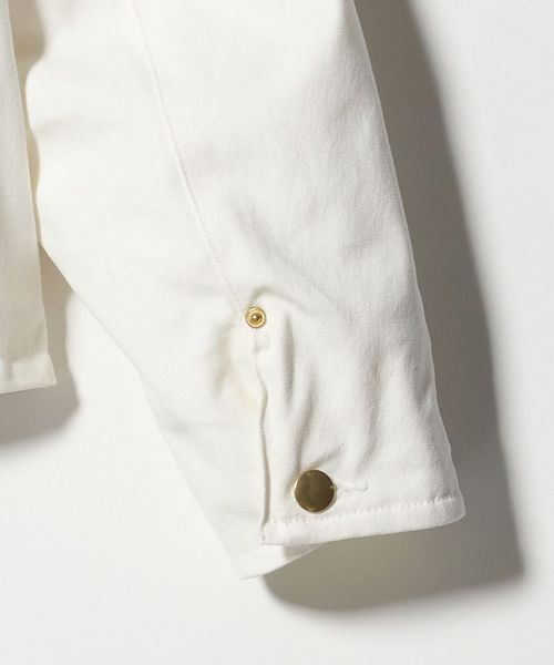 ワークムード漂うメニーポケットや、ボタンやリベット等ゴールドのパーツがアクセントを添えるデザイン。