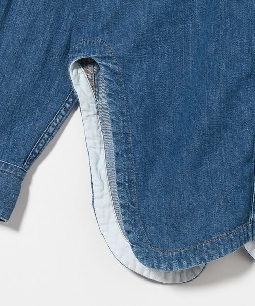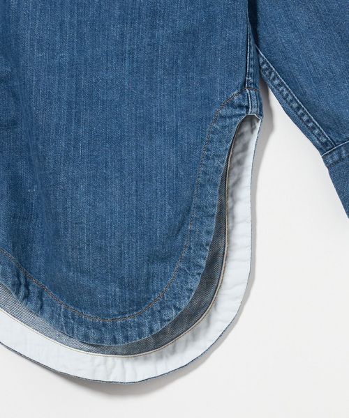 一見シンプルなデニムシャツですが、裾がアシンメトリーなデザインで波打つようにカーブしています。