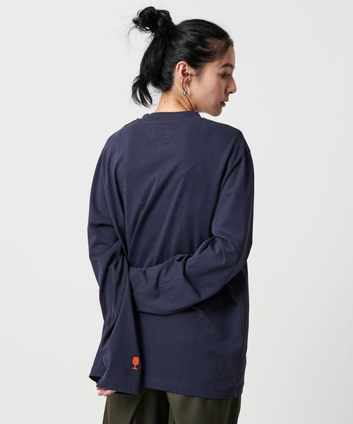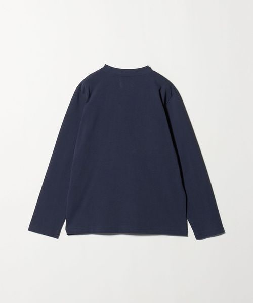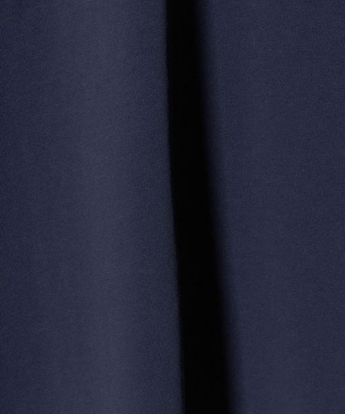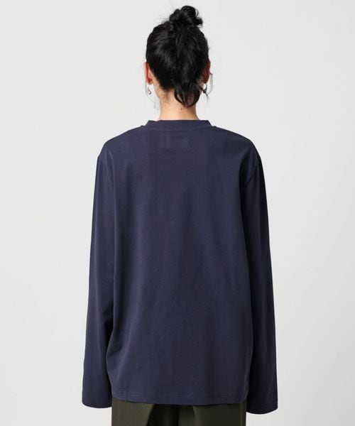 気軽に取り入れられる小さなロゴとネイビーベースのボディが、こなれた大人カジュアルにぴったりの一枚です。