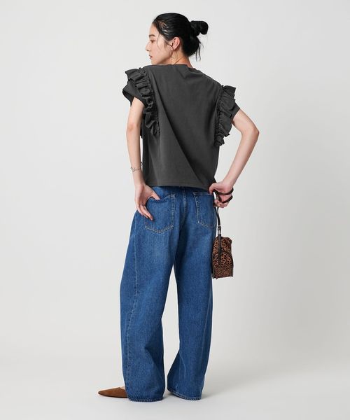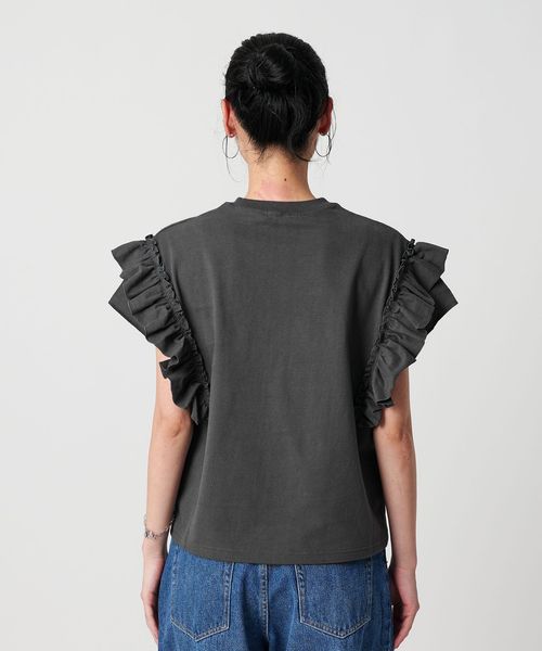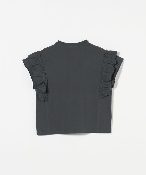 Tシャツの要素である首周りのリブやフェード感ある生地を用いてフリルの甘さを抑え、カジュアルな印象に仕上げました。