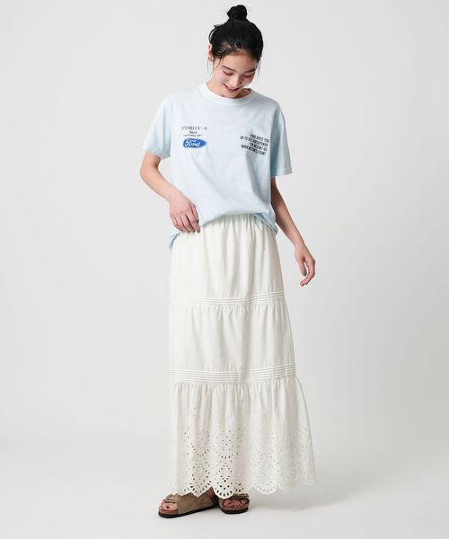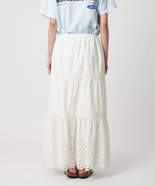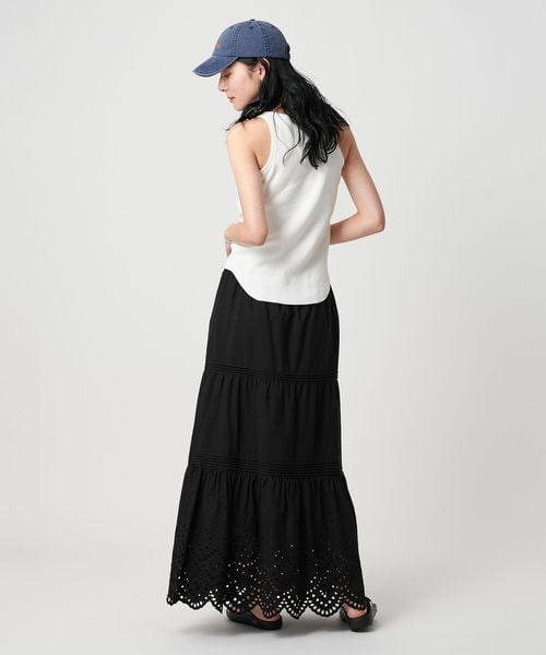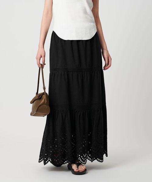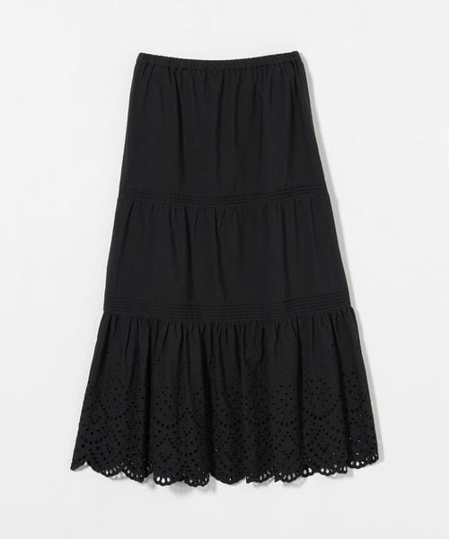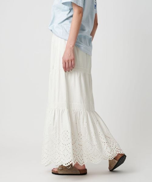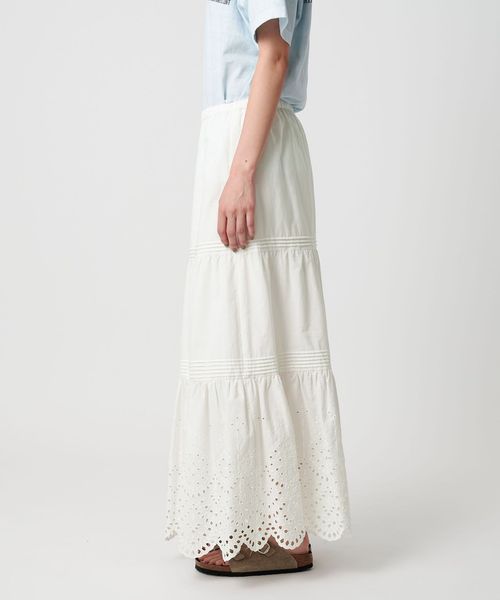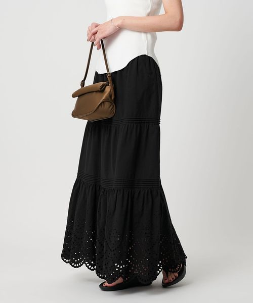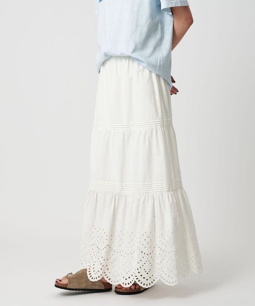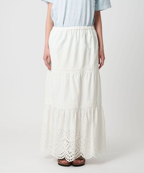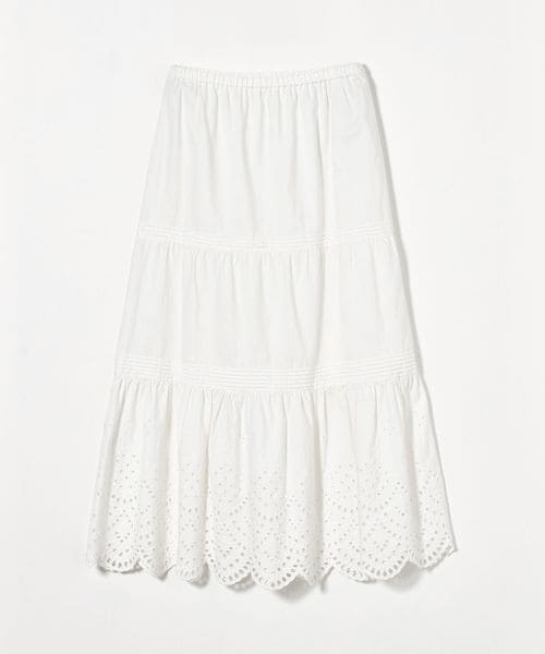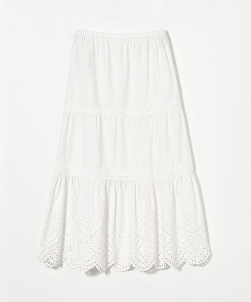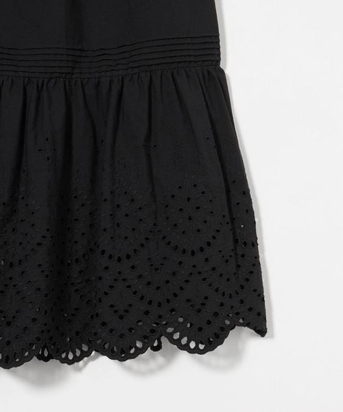 裾にかけてボリュームの出るティアード型で、足元の大きめのカットワークレースが存在感のある一着。