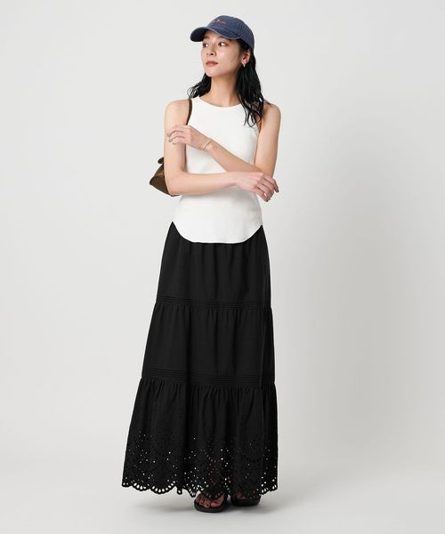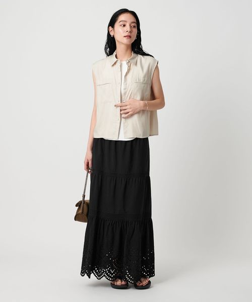 ノースリーブなどヘルシーな肌見せアイテムとクールな印象のコーディネートも◎。