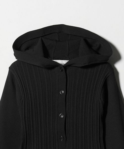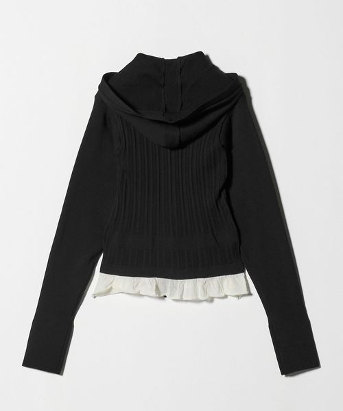 裾にシアーフリルをあしらった、フード付きリブニットカーディガン。