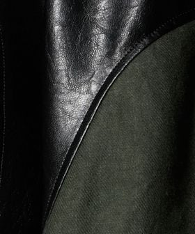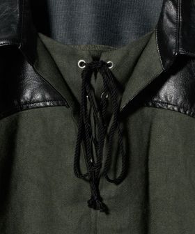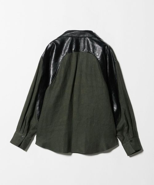 麻をベースにレザーライク素材で切り替えたディテールがデザイン性溢れる一着。