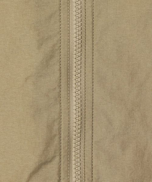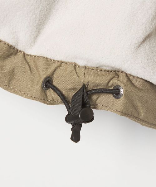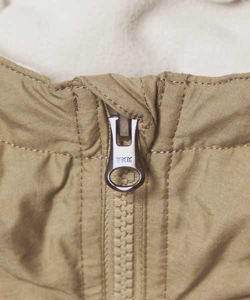軽さとかさ高感のあるポリエステルの中綿を入れ、身頃とフードの裏地には肌触りの良いフリース生地を使用した、あたたかみのある仕様が特徴。
