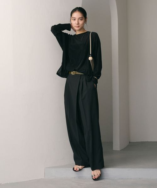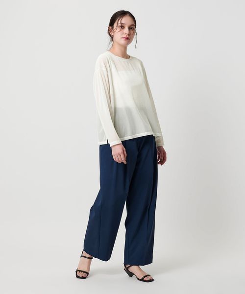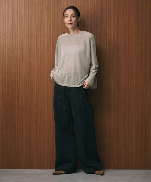 ワイドデニムなどのカジュアルボトムからきれいめパンツまで、幅広いテイストでお使いいただけるトップスです。