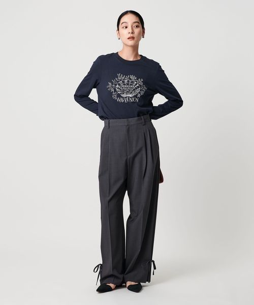 タック入りのボトムなど、きれいめなアイテムとのテイストミックスコーデがおすすめ。