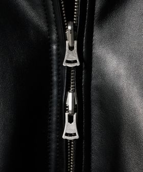 シルエットとレザーライクの質感で個性が光るジップアップフーディ