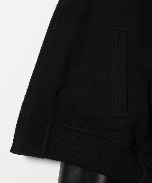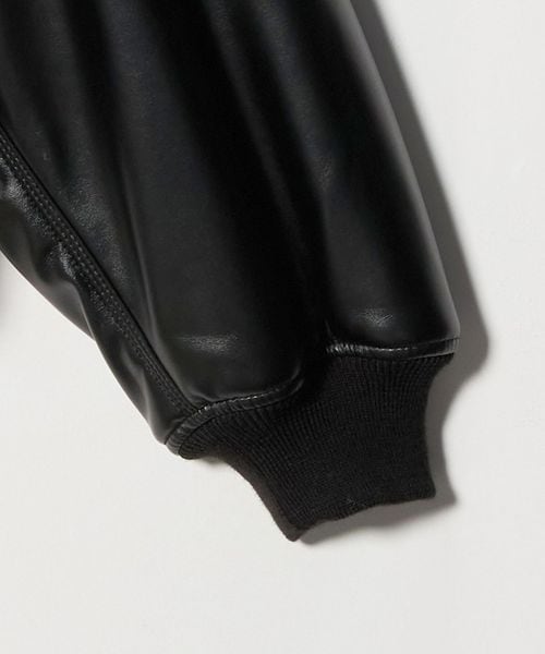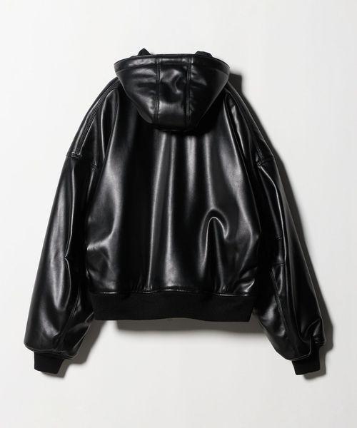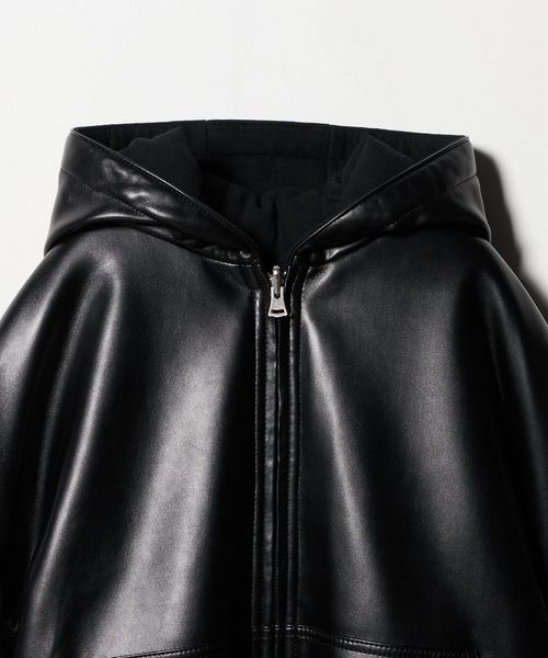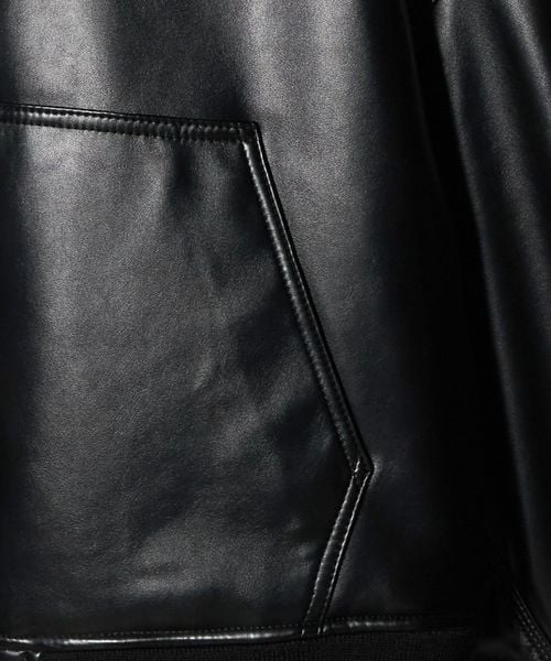 スウェットフーディのデザインをレザーライクな素材で表現したブルゾン。