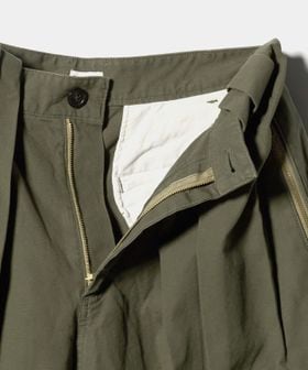 大きいサイズのパンツのウエストをぎゅっと絞ってはいた際にできたようなタックを入れ、ボリューム感を出したシルエットとファスナー使いが特徴的。