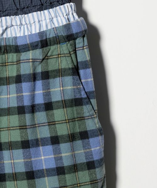 パジャマパンツをベースに、インナーをレイヤードしているようなウエスト部分のデザインが特徴的なパンツ。